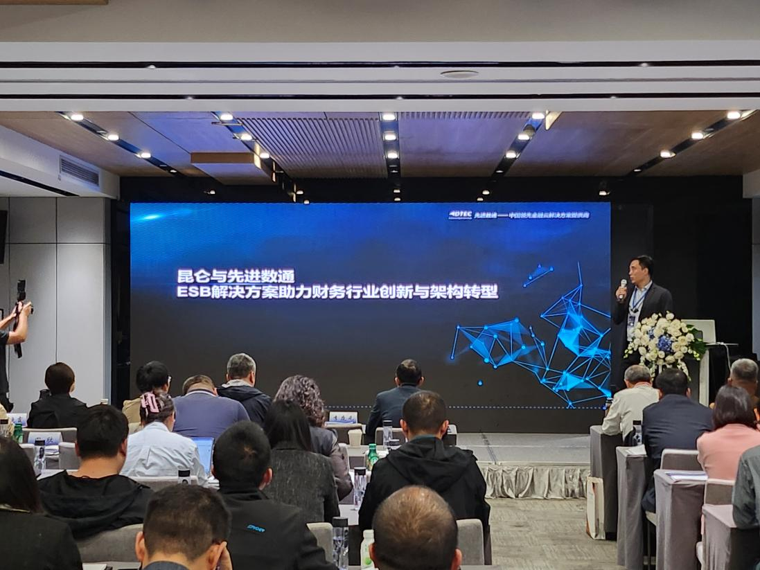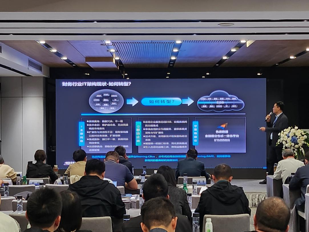 EVO视讯代表讲师郭钰以《昆仑与EVO视讯ESB解决方案助力财务行业创新与架构转型》为主题作发言分享。他深入剖析了当前财务行业IT架构面临的挑战,包括系统孤岛、技术老旧、扩展性不足等问题,并提出了基于企业服务总线(ESB)和微服务架构的转型方案。